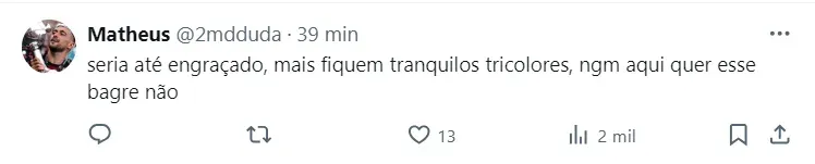 “Antes de saber pela internet, o Fred me ligou. Pensei: ‘Aconteceu alguma coisa’. Atendi o celular, ele me falou: ‘É mentira, né?’. Eu juro que não sabia. Ele: ‘Você vai para o Flamengo?’, eu respondi: ‘Cara, sabe que horas são? 02h da manhã’. Falei que não estava sabendo de nada (…) Era só boato, não fui procurado em momento nenhum, por nenhum time”, finalizou.