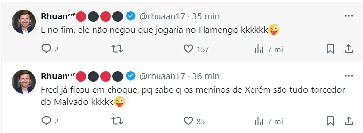 “Era boato, era boato. Não fui procurado em momento nenhum, nem meus empresários. Fiquei sabendo pela internet”, iniciou Nino, que revelou a preocupação do ex-atacante Fred em vê o zagueiro indo para o Urubu.