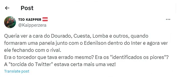 “Se a direção acertar essa contratação, tem que demitir o vice-de-futebol com a máxima urgência”. “Esse jogador não quer jogar bola, é um aposentado”. “Não quero o volante por aqui, já jogou um bom tempo no Inter e não possui qualquer apreço pelo nosso clube”.