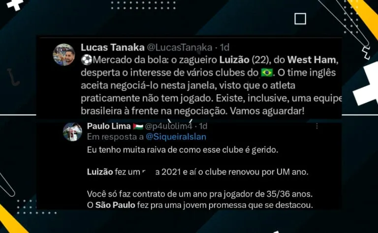 Ex-zagueiro do São Paulo e atualmente no West Ham, da Inglaterra, Luizão está na mira de alguns times brasileiros novamente. Ele, que foi revelado pelas categorias de base do time do Morumbi e saiu em 2023.]