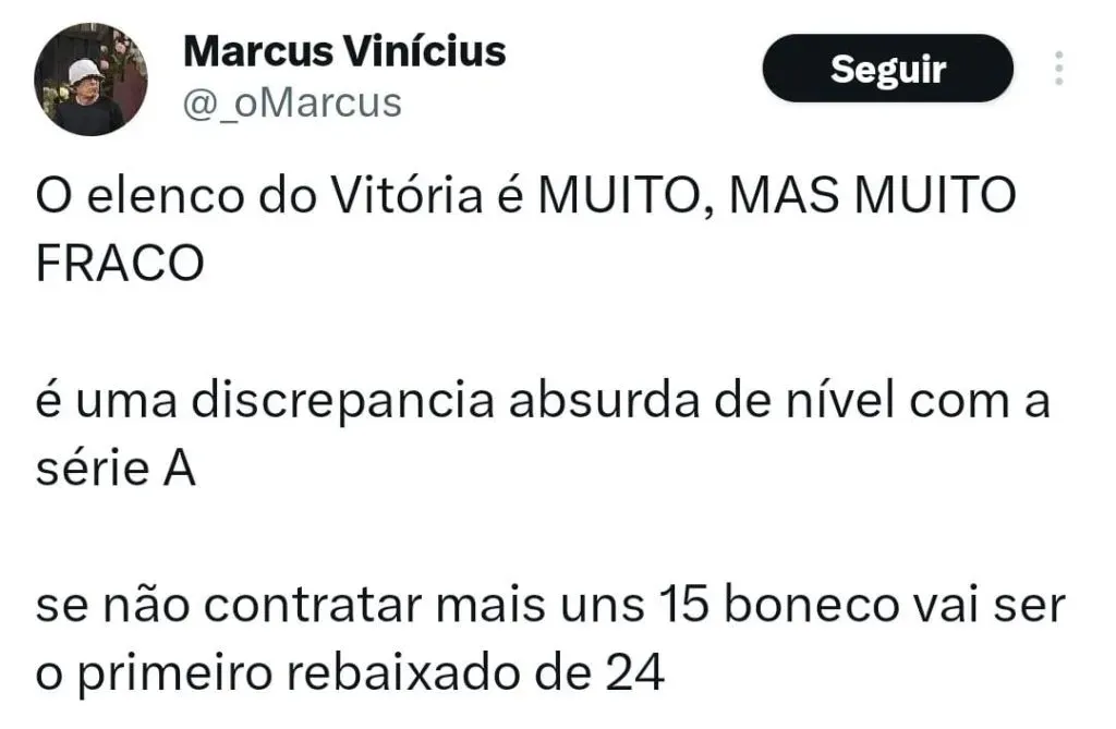 “Não tem ninguém para sair do Vitória. Vamos deixar bem claro, não tem proposta. Até o dia 10 de julho, ninguém pode estrear, como ninguém pode sair. A não ser que peça para sair. Ninguém é maior que o Vitória (…) Lista de dispensa não existe. Carpini tem que se adaptar com esse elenco até 10 de julho para que a gente dê sequência ao nosso projeto”, garantiu o dirigente.