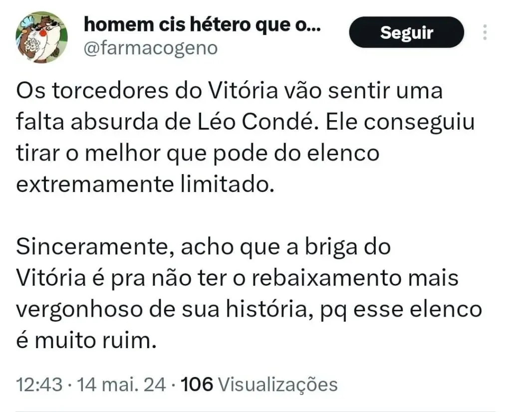 “Vai ficar no Vitória quem quer jogar no Vitória. Agora, quem não quer, não pode ficar. Se o jogador pede para sair, não tenho o que fazer. Se não pede para sair, vai continuar. Dudu e Wagner (Leonardo) têm contrato até 2025, Matheuzinho até 2026. Não temos intenção de liberar ninguém, nem que proposta tenha”, prosseguiu.