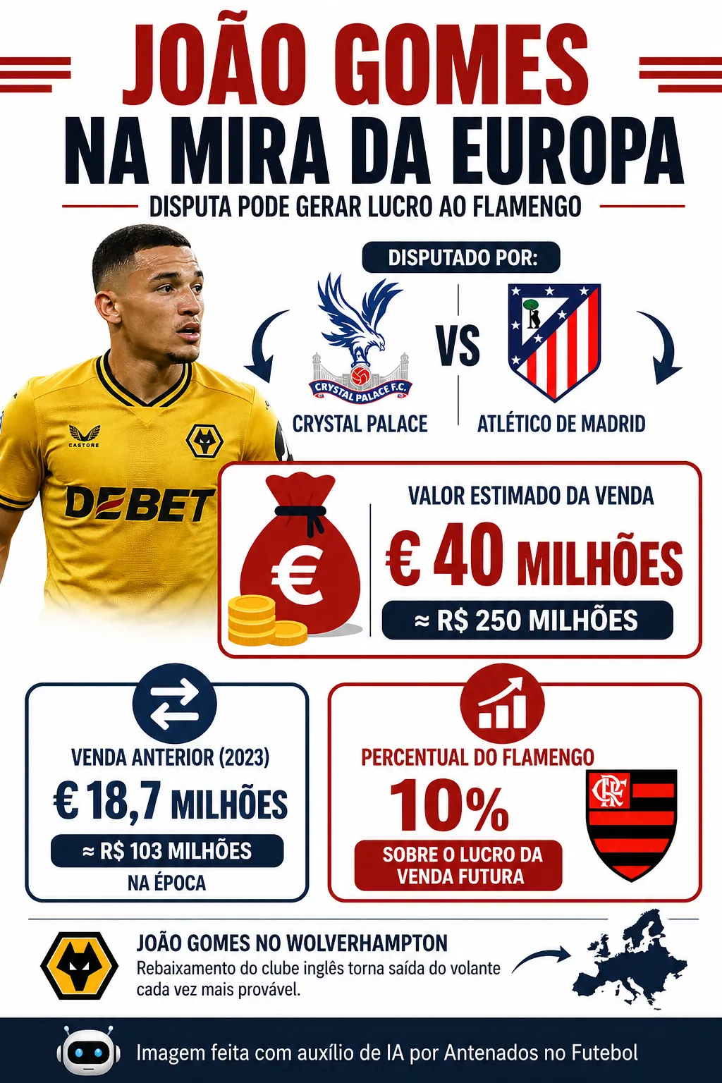O Flamengo acompanha com atenção a movimentação do mercado envolvendo João Gomes, um dos nomes recentes mais valorizados formados pelo clube. Atualmente no Wolverhampton, o volante entrou na lista de negociáveis após o rebaixamento da equipe inglesa, cenário que abriu espaço para uma possível transferência já na próxima janela.