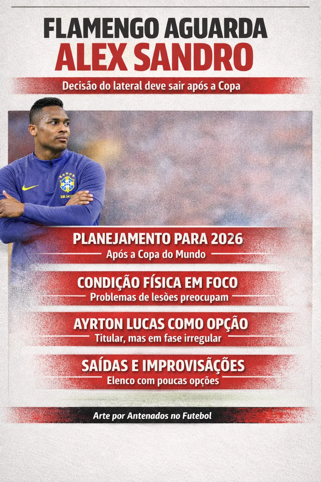 O Flamengo já traçou sua estratégia para a próxima janela de transferências, mas condiciona qualquer movimento à definição de um nome importante do elenco. O clube monitora o mercado em busca de um lateral-esquerdo, porém só pretende avançar após a decisão de Alex Sandro sobre seu futuro.