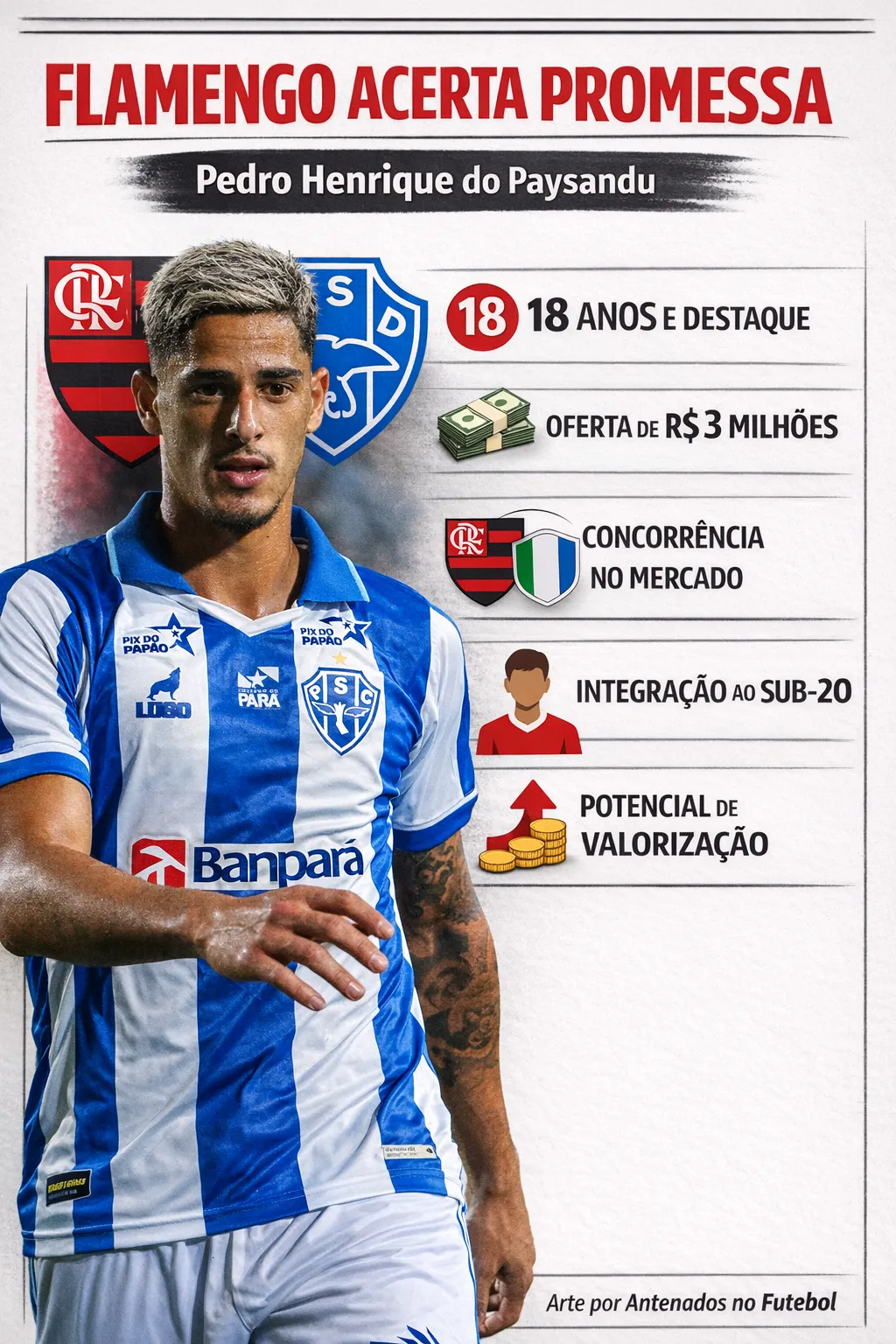 O Flamengo avançou nas negociações e está muito próximo de oficializar a contratação do volante Pedro Henrique, de apenas 18 anos, destaque recente do Paysandu. Segundo apuração do ge, o clube carioca ofereceu cerca de R$ 3 milhões por 85% dos direitos econômicos do jogador, com vínculo previsto por três temporadas.