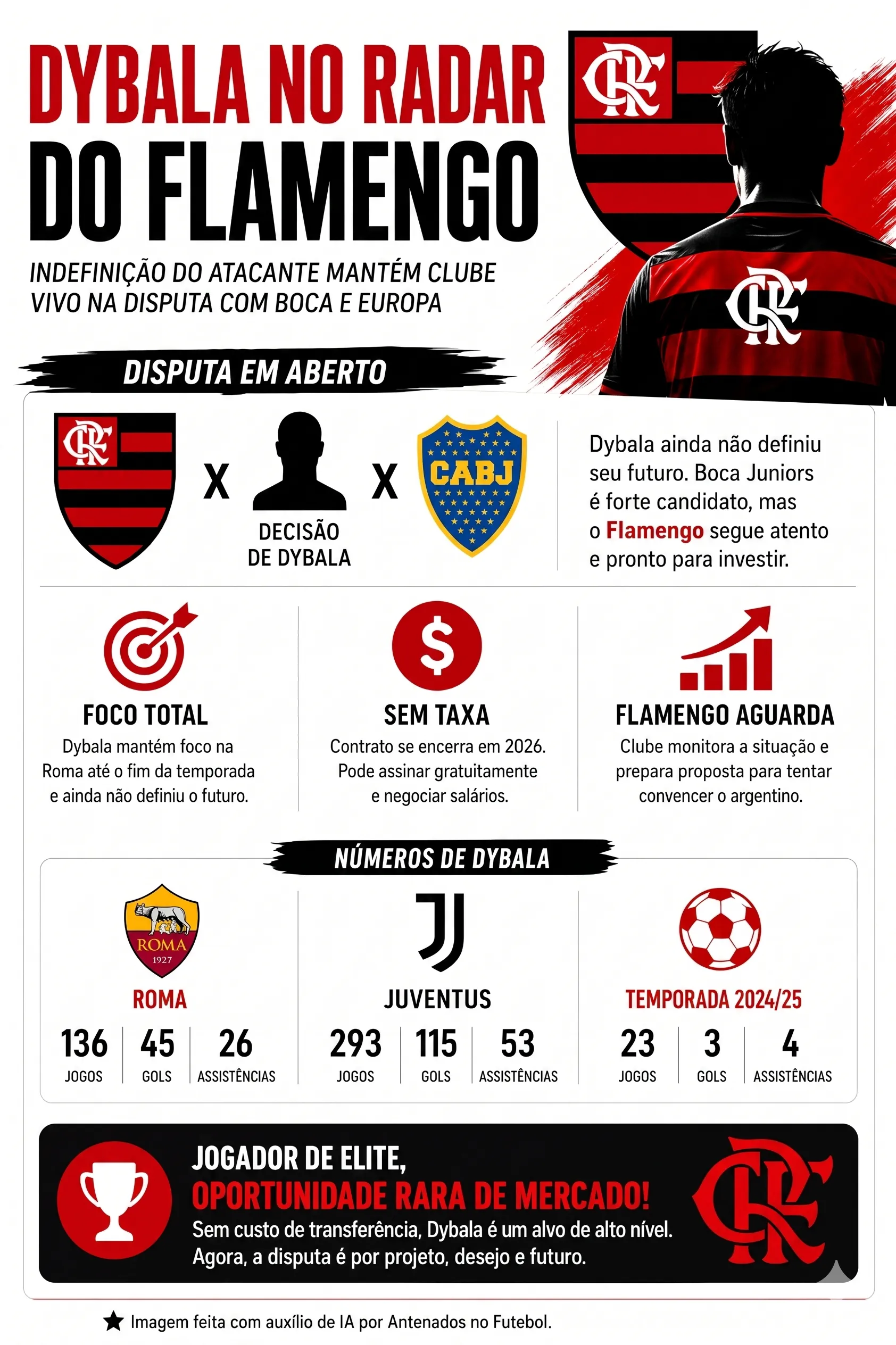 O Flamengo segue atento ao mercado e vê uma oportunidade se manter viva envolvendo Paulo Dybala. Mesmo com negociações em andamento com o Boca Juniors, o jogador ainda não tomou uma decisão definitiva sobre o futuro.