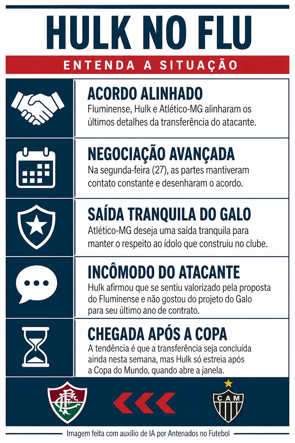 A publicação do GE acrescenta que, na última segunda-feira (27), as partes mantiveram contato constante e enfim desenharam o acordo. O desejo do Fluminense e do Atlético é por uma transferência tranquila, sem a polêmica da primeira investida do Tricolor por Hulk em janeiro.