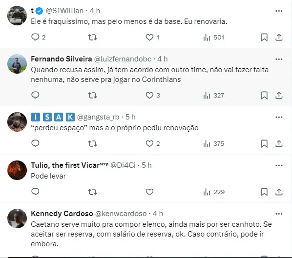 Neste sábado (20), o GE, publicou uma matéria falando sobre o futuro do jovem Caetano, que perdeu espaço com a chegada do técnico português no clube paulista. O defensor atuou em nove das 19 partidas do Corinthians na temporada, ele recebeu sondagens do Athlético-PR, mas o Timão recusou. Caso não ganhe oportunidades o cria do Terrão pode pedir para sair em julho.