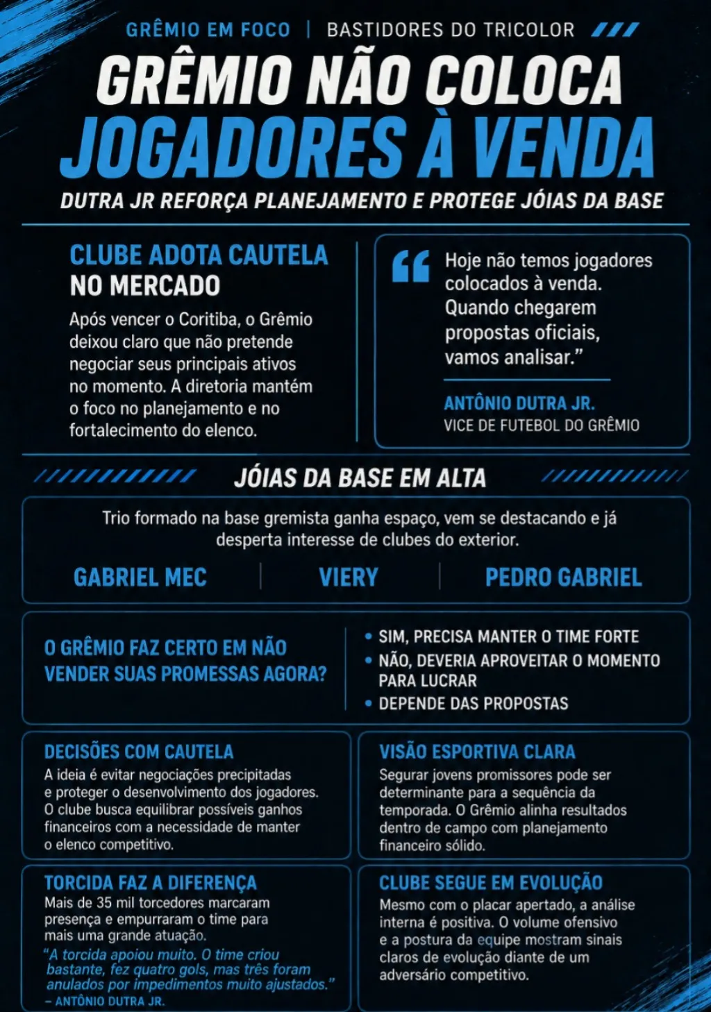Nesse cenário, o vice de futebol, Antônio Dutra Jr., foi direto ao abordar o tema. Contudo, sua fala reforçou a ideia de que o clube não pretende abrir mão de seus principais ativos neste momento. “Hoje não temos jogadores colocados à venda. Quando chegarem propostas oficiais, vamos analisar”, afirmou Dutra Jr.