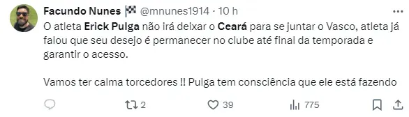 Dentre um dos jogadores que vem recebendo sondagens de gigantes brasileiros está Erick Pulga. Nesta sexta-feira (12), uma notícia sobre seu futuro veio a tona e agitou os torcedores na web.