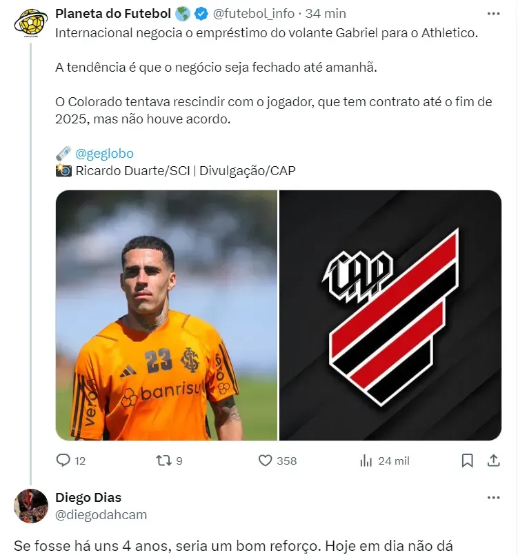 De acordo com informações apuradas pelo GE, o Internacional negocia o empréstimo de Gabriel junto ao Athletico Paranaense. O meio-campista está fora dos planos da comissão técnica desde março, quando foi afastado.