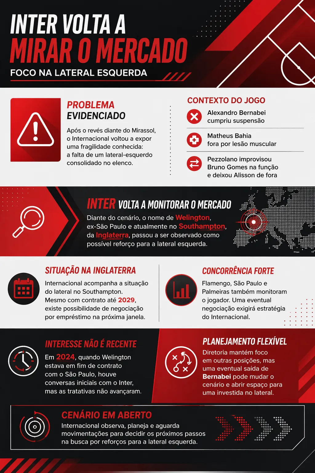 Diante desse contexto, o Internacional voltou a monitorar o mercado. Nesse sentido, o nome de Welington, ex-São Paulo e atualmente no Southampton, da Inglaterra, passou a ser observado como possível reforço para a lateral esquerda.