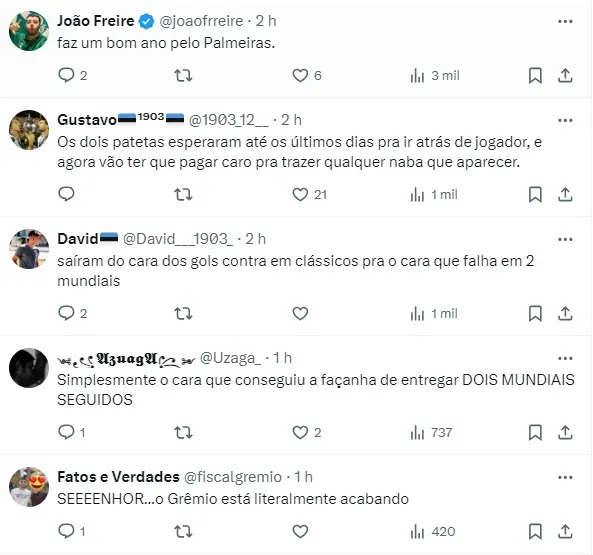 Leia mais: Marchesín ‘desabafa’ sobre críticas após falha na Libertadores pelo Grêmio “Às vezes falam demais”