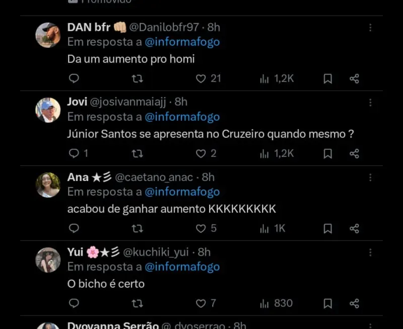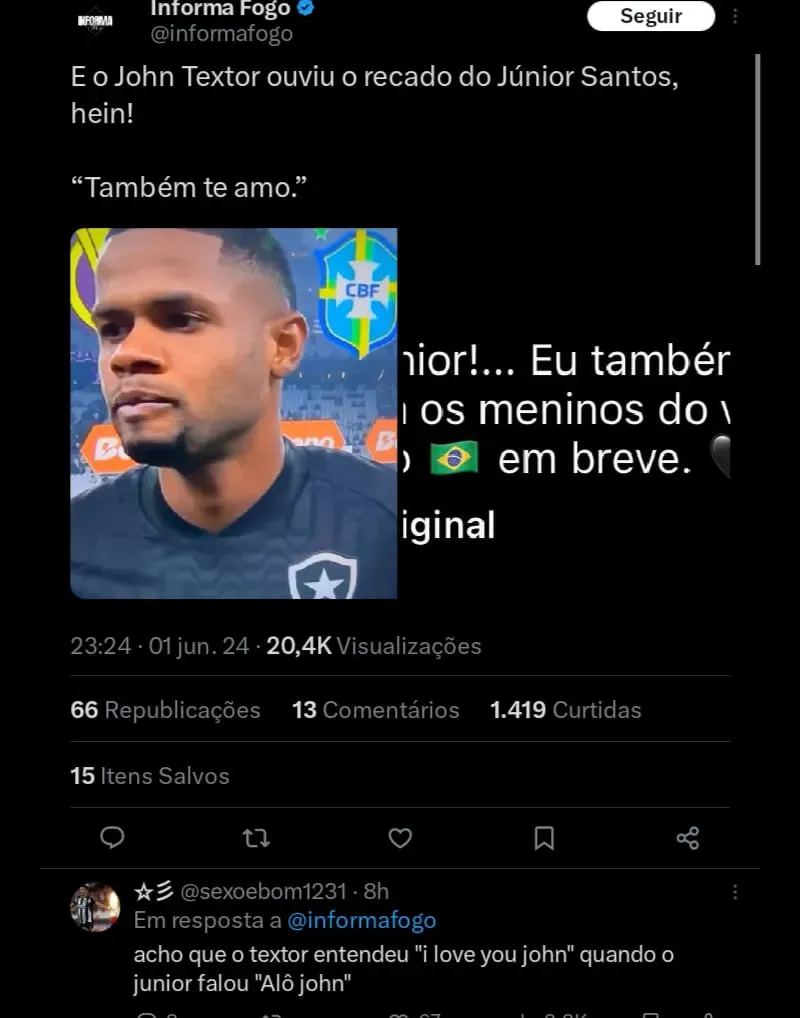 Após a decoração de Júnior Santos, John Textor respondeu o jogador através das redes sociais: “Olá, Júnior!…Eu também te amo! Bom jogo…parabenize os jogadores no vestiário por mim! Verei vocês todos no Brasil daqui a pouco.”
