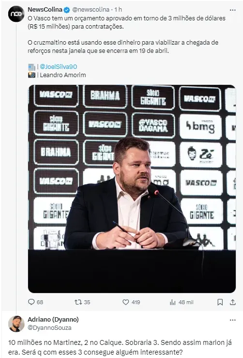 Porém, o Gigante da Colina também tem interesse em trazer mais atletas. De acordo com informações apuradas pelo jornalista Joel Silva, o Vasco tem um orçamento aprovado em aproximadamente 3 milhões de dólares (R$ 15 milhões) para se reforçar.