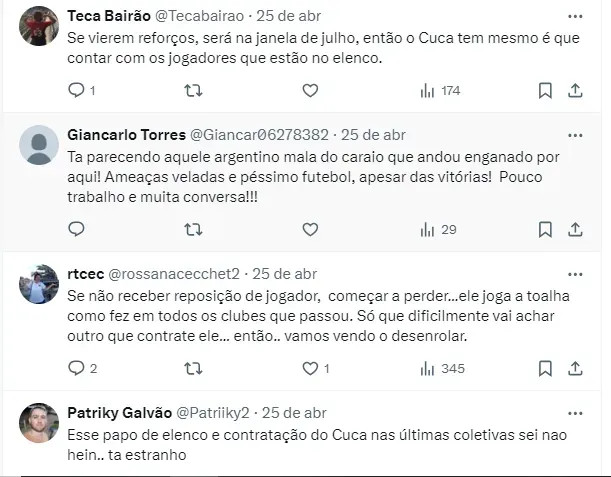 “Não é nem o Cuca pedir, é uma troca que temos feito em prol do Athletico para acharmos a formação ideal, jogadores ideais e é isso que vamos fazer constantemente. A troca é sábia e vem acontecendo para que a gente possa melhorar cada vez mais a equipe”, completou.