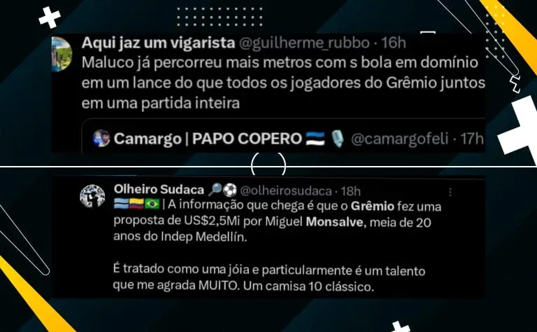 O Grêmio está negociando a contratação de Miguel Monsalve, jogador colombiano de 20 anos, do Independiente de Medellín. O jogador é o camisa 10 da equipe e está em seu segundo ano como titular absoluto.
