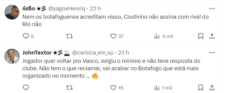 Entretanto, a disputa pelo jogador não está restrita ao Vasco. O Botafogo, outro clube tradicional do Rio de Janeiro, também manifestou interesse na contratação de Coutinho.