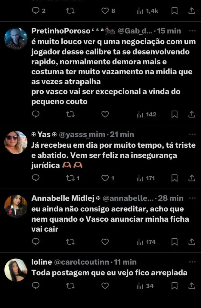 Atualmente, os empresários de Coutinho acompanham a situação de perto. Caso tudo caminhe bem, o meio-campista desembarca em São Januário na segunda janela de transferências, que abre em 10 de julho.