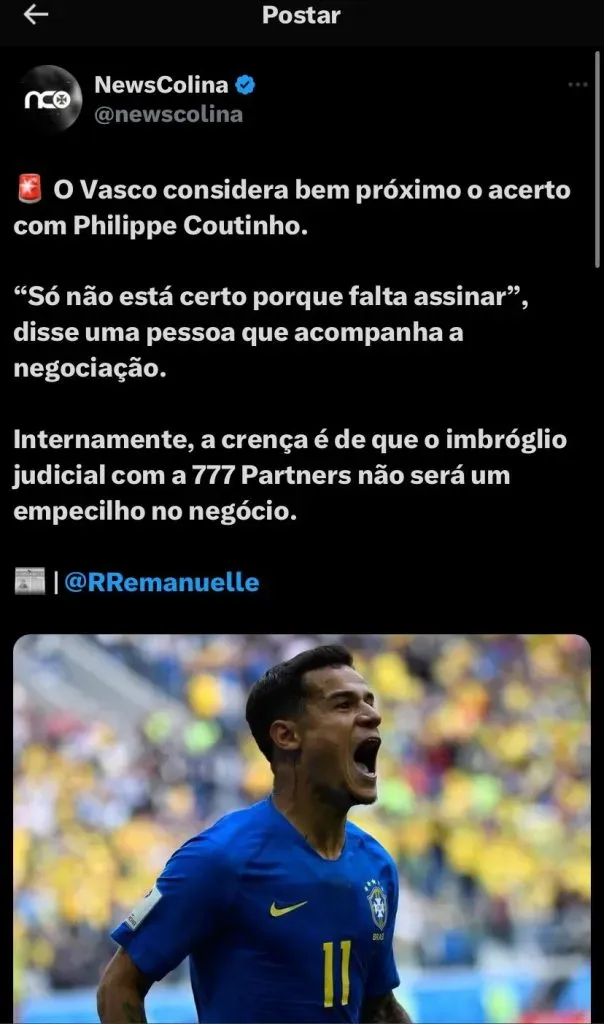 Após o time conquistar a classificação para as oitavas de final da Copa do Brasil, o jornalista Rica Perrone confirmou que o negócio está em fase avançada. Além de Coutinho, a diretoria irá contratar mais um reforço de peso.