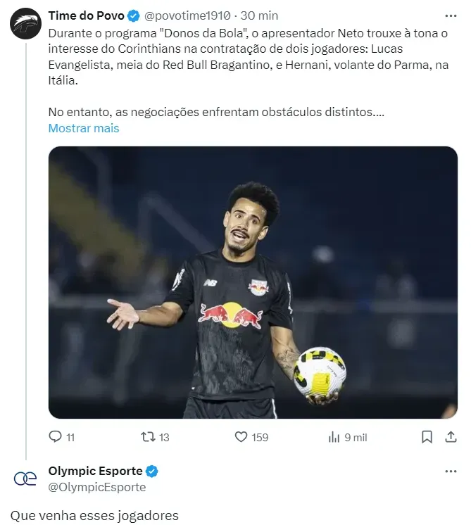 Durante o programa Donos da Bola, da TV Bandeirantes, o apresentador Neto revelou que o time paulista quer contratar dois jogadores. “O Corinthians é louco para contratar o Evangelista e o Hernani também, que é bom de bola”, disse.