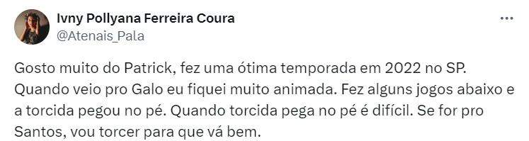 Apesar disso, o jornalista deixou claro que ainda falta um detalhe para que a negociação seja concluída. “Patrick vai precisar readequar o seu salário ou contar com ajuda do Galo para ter seus vencimentos mantidos em R$ 800 mil por mês (pelo menos até o fim da temporada)”, finalizou.