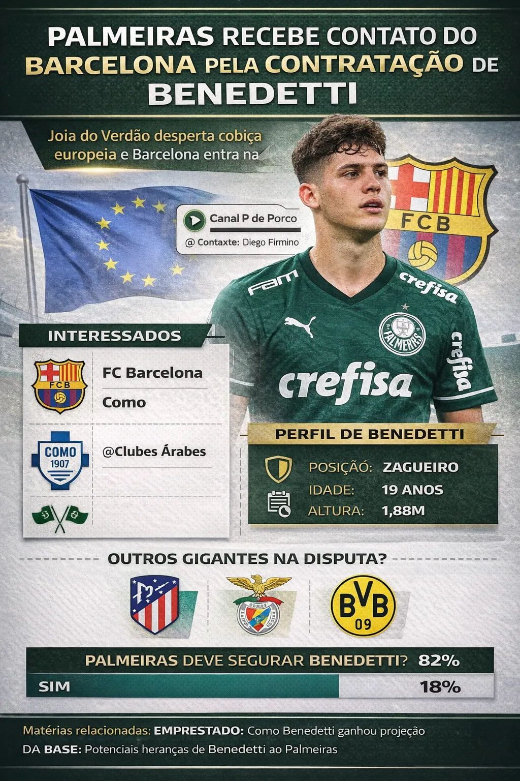 O Palmeiras segue na mira do mercado internacional por conta de mais uma joia formada na Academia de Futebol. O zagueiro Benedetti, de apenas 19 anos, vem recebendo constantes sondagens de clubes europeus, com destaque para o Como, da Itália, e também o Barcelona, que acompanha de perto a situação do jovem defensor. A informação foi divulgada por Diego Firmino, do Canal P de Porco.