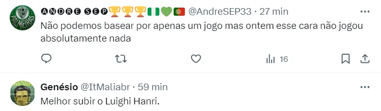 Mas outro assunto veio à tona nos torcedores: Viña. O ex-lateral do Verdão, que agora defende o Flamengo, vem sendo muito criticado no rival. Sendo assim, a situação do atleta repercutiu na torcida palmeirense.