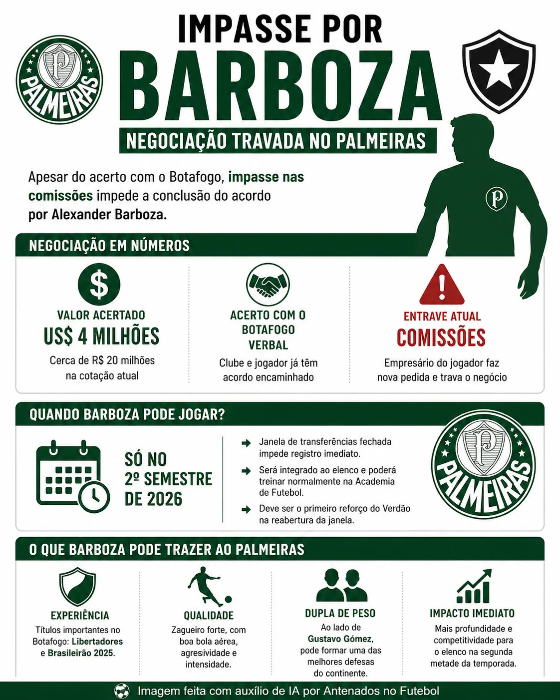 Com uma passagem vitoriosa pelo Botafogo, onde conquistou a Copa Libertadores da América e o Campeonato Brasileiro de 2025, Alexander Barboza chegaria ao Palmeiras por cerca de 4 milhões de dólares (R$20 milhões na cotação atual). Valores considerados atrativos pela qualidade do defensor e pelas características que ele poderia agregar ao elenco comandado por Abel Ferreira.