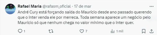 Cury já foi representante do time catalão no Brasil e recentemente negociou Vitor Roque com o Barça. Vale lembrar que Maurício tem vínculo com os gaúchos até o final de 2027.