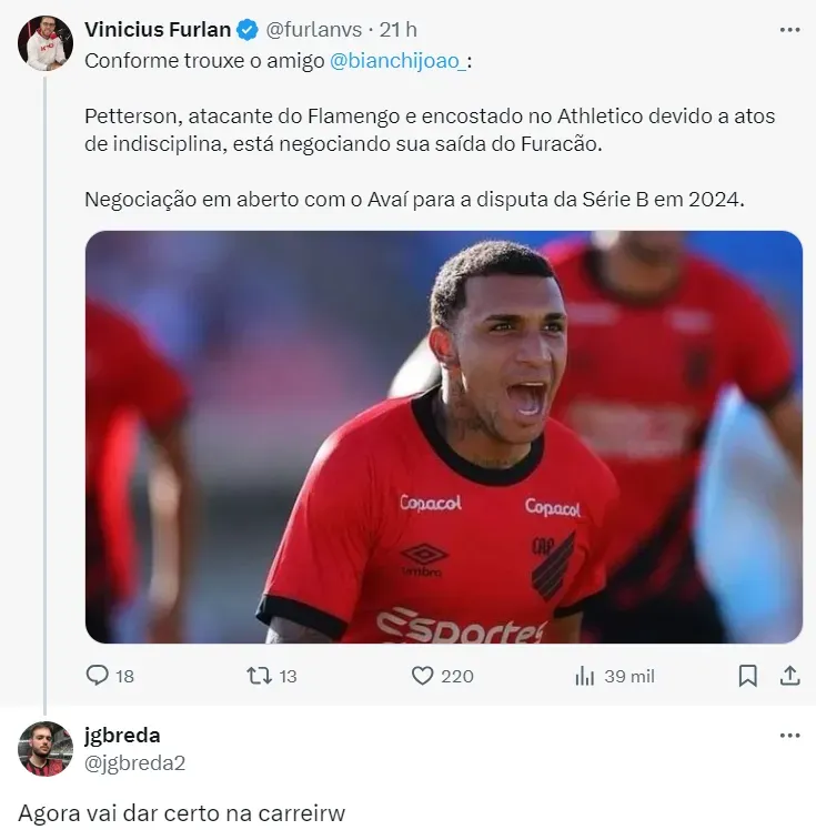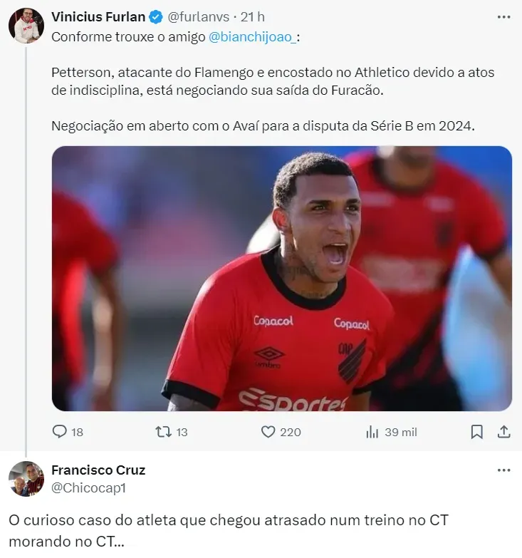De acordo com informações apuradas pelo jornalista JP Bianchi, Petterson abriu negociações com o Avaí para a disputa da Série B do Brasileirão. No momento, ele está afastado do Furacão por atos de indisciplina.
