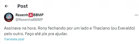 Sobre o tema em questão, nas últimas horas, João Gabriel Leiro, especialista em notícia do Tricolor, mandou o seguinte recado para os torcedores. “Sei que não seria uma unanimidade, pois não vive uma boa fase, mas o menino Rony Rústico cairia como uma luva nesse esquema do Bahia”.
