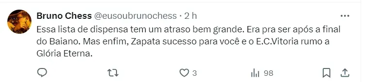 O defensor, que recebeu uma proposta de outra equipe, pediu para ser liberado, decisão que foi aceita pela diretoria. Zapata, com uma carreira que inclui passagens por clubes renomados como Milan, Genoa e Villarreal, chegou ao Vitória no início de 2024, mas não conseguiu se firmar.
