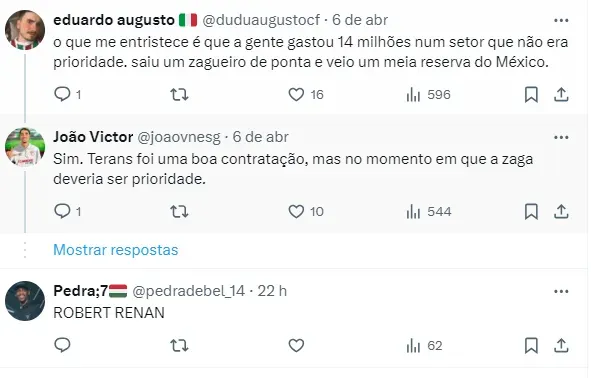 “O Fluminense precisa urgentemente ir ao mercado e buscar um zagueiro. Eu acho esse Fluminense enfraquecido em relação ao do ano passado, unicamente e exclusivamente por causa do Nino. O Fluminense não achou, não buscou e ele faz uma diferença danada”, disse.