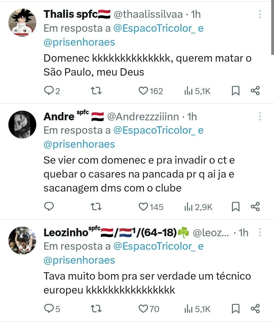 Apesar das especulações, de acordo com informações da TNT Sports, o São Paulo procurou o uruguaio Diego Alonso de 49 anos, o português Carlos Carvalhal de 58 anos e o espanhol Domènec Torrent de 61 anos e que tem passagem pelo Flamengo.