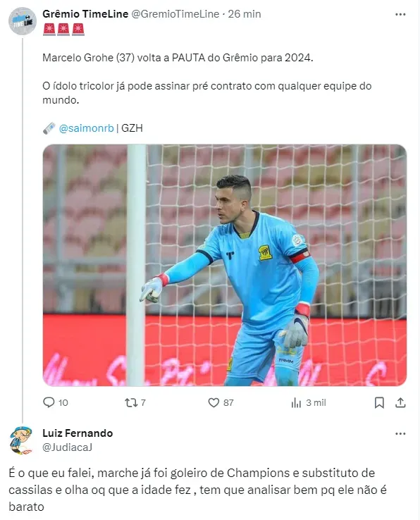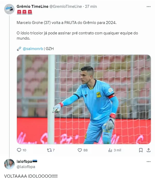 Apesar disso, um dos assuntos que veio à tona recentemente foi JP Galvão. Após receber críticas, o jogador falou sobre onde quer atuar em 2024 e agitou as redes sociais. Em contrapartida, o tema do momento na torcida é Marcelo Grohe.