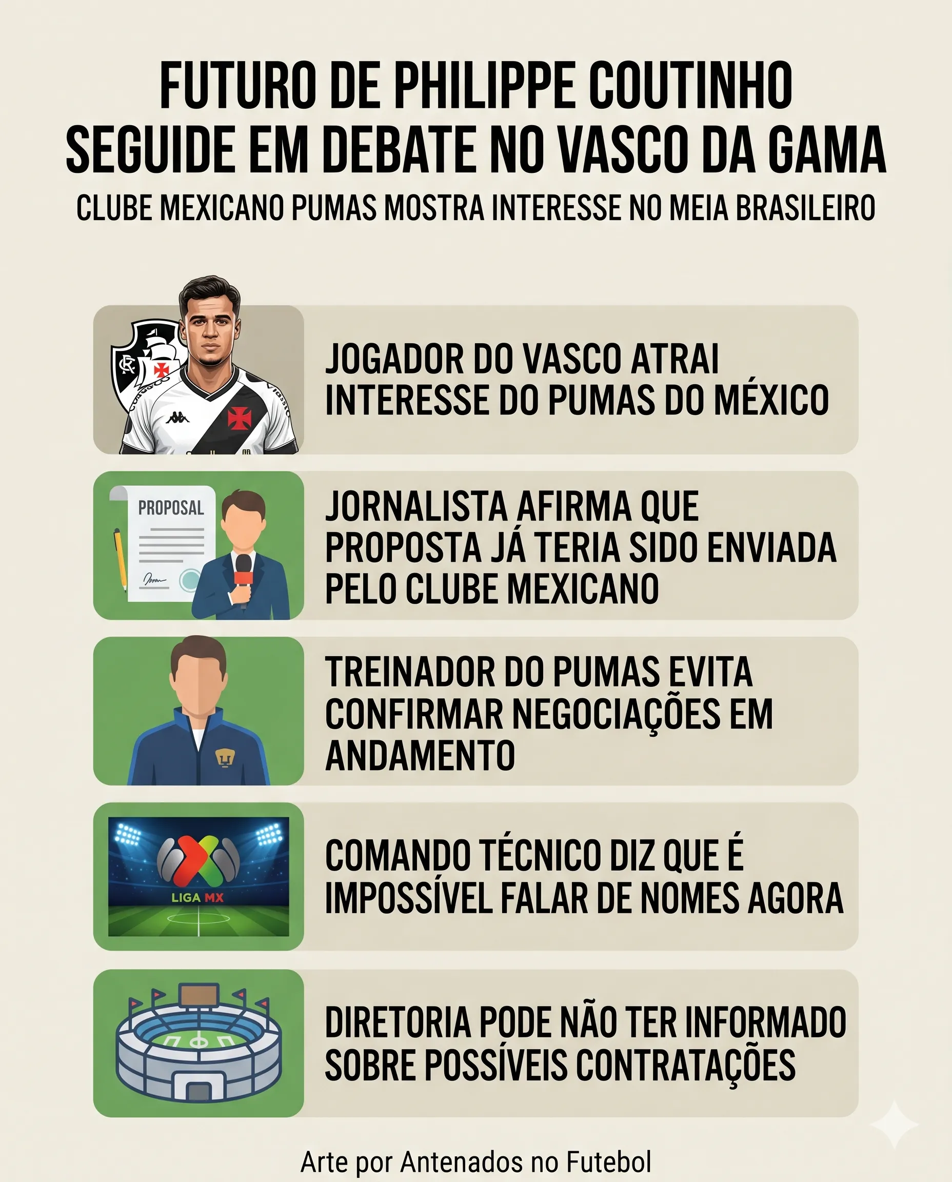 O futuro do meia Philippe Coutinho segue sendo um assunto bastante debatido no Vasco da Gama. Isso porque o jogador passou a interessar o Pumas, do México, que já teria enviado uma proposta para contratar o atleta, conforme aponta o jornalista Emerson Rocha, do canal Atenção Vascaínos.