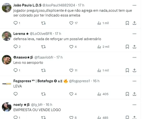 Nas redes sociais, os botafoguenses aprovaram a saída do atacante. “Levo no aeroporto”, disse um torcedor. “Jogador preguiçoso,displicente é que não agrega em nada, scout tem que ser cobrado por ter indicado essa ameba”, analisou outro.