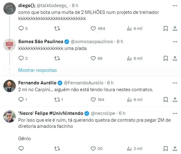 Nesta terça-feira (16), uma notícia sobre a saída do comandante do Soberano veio a tona. A quantia que o São Paulo terá que pagar para Thiago Carpini, caso se concretize a demissão é de R$2 milhões. Informação de do GE.
