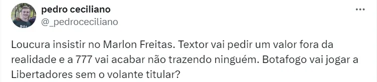 Segundo a fonte, caso Marlon Freitas não venha, o Cruz-Maltino vai guardar a aprovação do dinheiro que seria gasto no atleta para na janela do meio do ano, dessa forma, tentará contratar outro jogador de maior calibre.