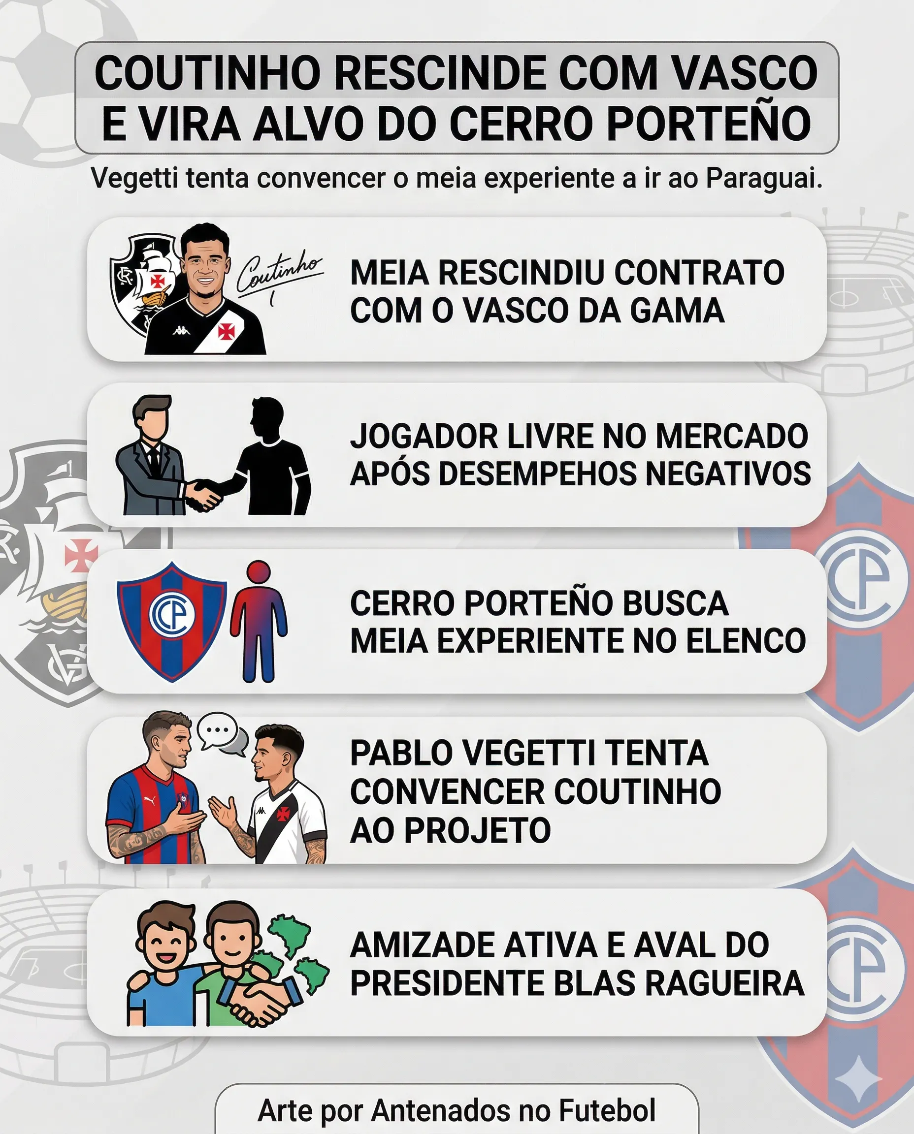 A movimentação para levar Coutinho ao futebol paraguaio passa diretamente pelo atacante Pablo Vegetti, ex-Vasco e atualmente no Cerro Porteño. O jogador tenta convencer o meia a aceitar o projeto esportivo do clube.