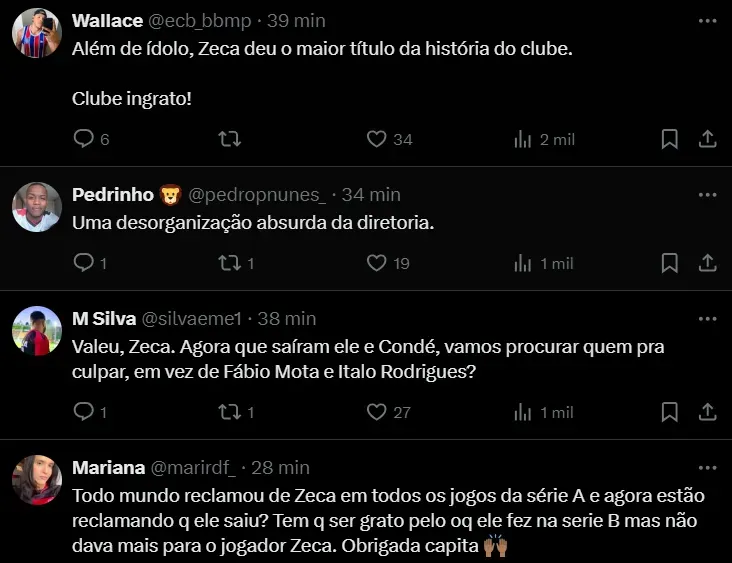 O presidente do clube, Fábio Mota, também se pronunciou: “Estamos com nosso capitão, campeão brasileiro e baiano. Hoje não é um dia feliz. Ele veio se despedir, está nos deixando. Vamos ficar torcendo por ele, esteja onde estiver. Não é só um atleta”, finalizou.