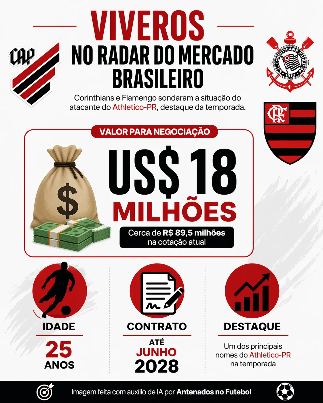 Sendo assim, a seguinte notícia foi revelada. Flamengo e Corinthians estão de olhos bem abertos no jogador de 25 anos de idade. Internamente, quando se pergunta sobre o destaque do Furacão a resposta é: “dos times que têm dinheiro para investir, todos já procuraram”.