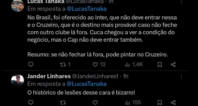 Anteriormente, havia informações de que o atleta não fecharia com a equipe mineira e que o negócio havia esfriado. No entanto, Lucas Tanaka trouxe essa atualização nesta quarta-feira (5).