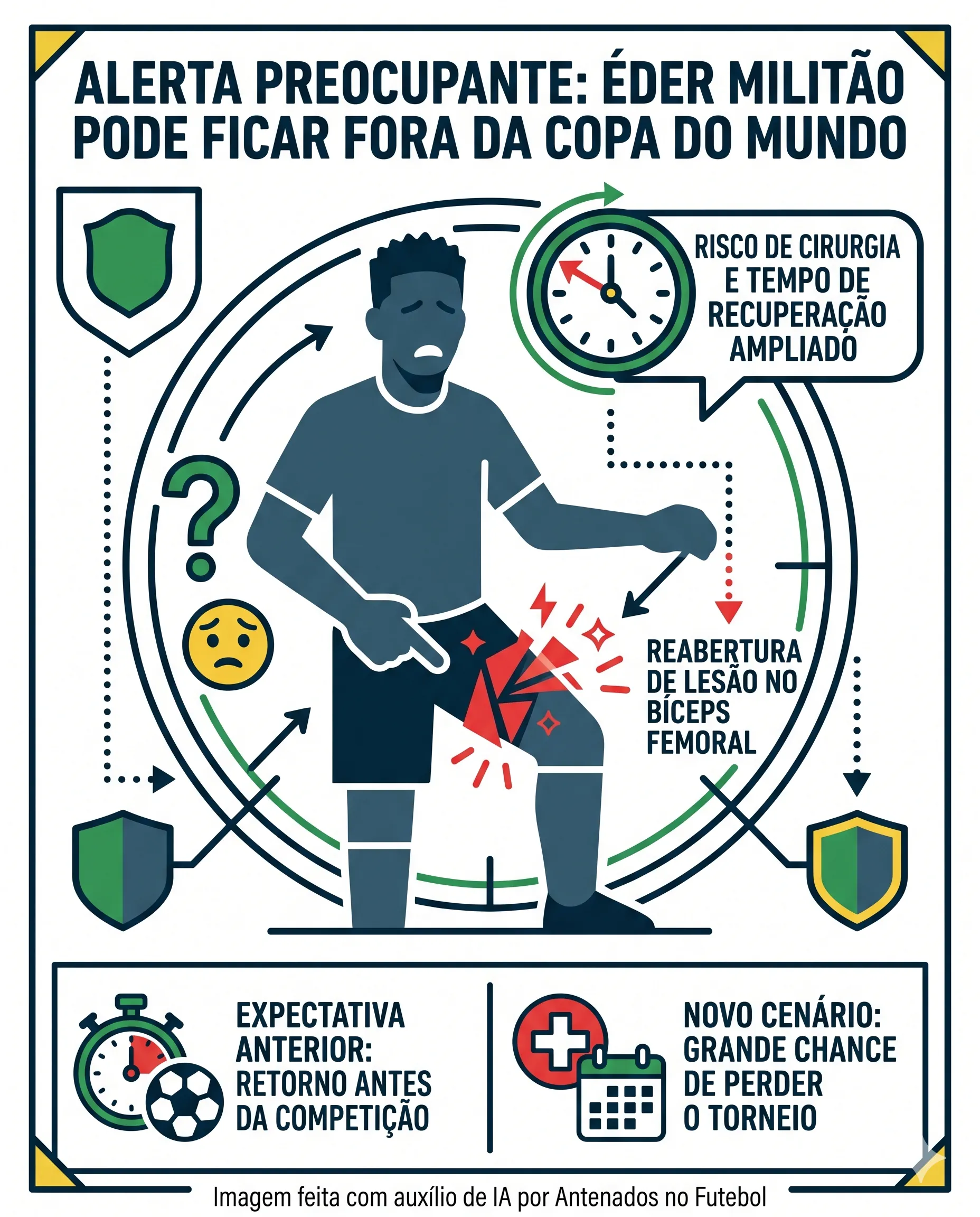 A situação do zagueiro Éder Militão preocupa muito os torcedores da Seleção Brasileira para a Copa do Mundo, já que o jogador sofreu uma lesão muscular no bíceps femoral da coxa esquerda. A princípio, a expectativa era de que ele retornasse antes do início da competição, mas uma nova informação mudou o cenário.