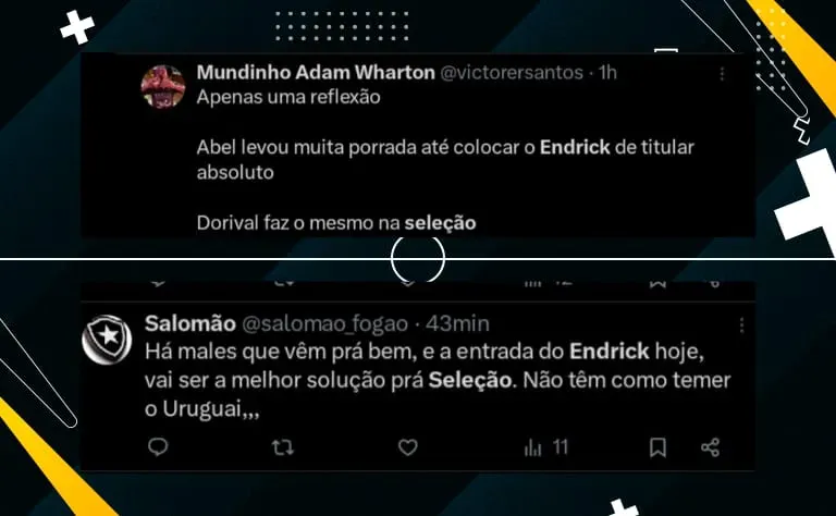 Além de futuro companheiro de time de Vinícius Júnior, Endrick irá assumir o posto de titular na Seleção Brasileira no lugar do atacante. Após Vini ser suspenso por conta de dois cartões amarelos, Dorival escolheu a joia palmeirense para assumir seu lugar.