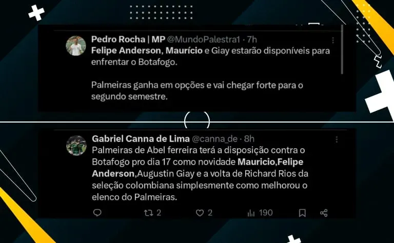 Para essa janela de transferência, o Verdão trouxe três reforços: Felipe Anderson, Giay e Maurício. Na próxima rodada, contra o Botafogo, na quarta (17), pelo Brasileirão, o trio poderá fazer a estreia, só depende do treinador.