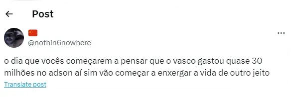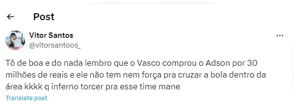 Sobre o revés em questão, mesmo com a ‘falha’ de Léo Jardim, nas últimas horas, outro jogador do escrete de Ramón Díaz foi criticado pelos torcedores: trata-se do atacante Adson. Sendo assim, os seguintes comentários vieram à tona (SIC).