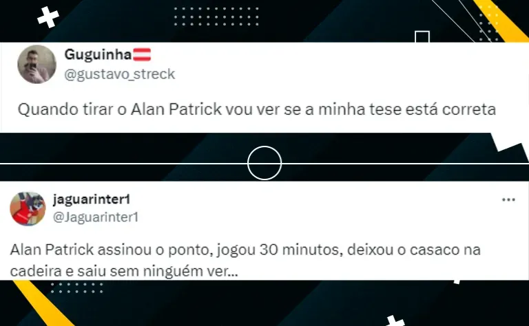 Todavia, ainda falando sobre o jogo diante de Campaz e cia. Após péssima partida, o meio-campista Alan Patrick virou o principal alvo dos torcedores nas redes sociais. Sendo assim, os seguintes comentários contra o jogador estão bombando na web (SIC).