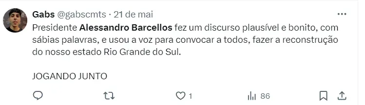 “Precisamos estar conectados. As ações serão conjuntas, recuperando o nosso patrimônio e ajudando o Rio Grande a se reerguer. É um compromisso que temos de assumir, mas ao mesmo tempo, olhar o que tem ocorrido. É muito difícil não se emocionar e não imaginar o que precisamos. Juntar forças. Desculpa”, disse Barcellos, emocionado.